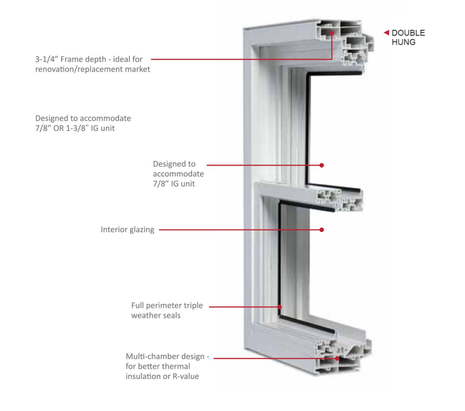 - Designed to accommodate 7/8″ Double-pane IG units. 3-1/4″ or 4-1/4″ frame depth – ideal for renovation/replacement market.
